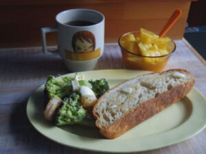自作のカンパーニュでバタートースト、海老とブロッコリーと茹で卵のサラダ、パインヨーグルト。