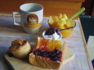 カフェで余ったスコーンとCICON Bakeryの食パンでジャムトースト、パインヨーグルト。プレーンスコーンには自作の粒あんと生クリーム、ジャムは自作の金柑、いぐり、うめ苺。