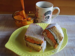自作のカンパーニュでトーストサンド、柿ヨーグルト。サンドの具は、キャロットラペ、自家製ロールハム、チーズ、大葉。大葉が結構良いアクセントだった。