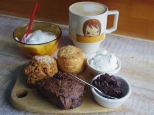 カフェで余ったスコーンとキャラメルスコーン、つむぎベーカリーのチョコスコーン、柿ヨーグルト。