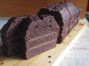 チョコレートレイヤーケーキは、ウェブショップと同じようにパウンド型で焼いて、チョコバタークリームを2段に挟んでます。