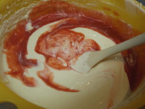苺とチョコのチーズケーキは、ベースのチーズケーキ生地にたっぷり苺を煮てピューレにしたものを混ぜ込んでます。土台のクッキー生地にはココア入り、上からチョコレートガナッシュを流してます。