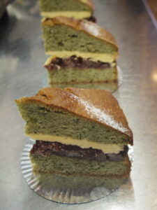 写真はよもぎ餡バタービクトリアケーキ。国産の乾燥よもぎを使ってよもぎ風味のバタースポンジを焼いて、丹波の大納言小豆を使った自家製粒あんと卵入りのコクのあるバタークリームをサンドしました。和菓子っぽい組み合わせですが、美味しく出来てます。