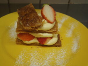 ミルフィーユはオーダー頂いてから組み立てます。塩気のあるザクザクのパイ生地は、バターを外側にして折るアンヴェルセという逆折のパイ生地で作ってます。ぽってりしたカスタードと苺は間違いない組み合わせ。