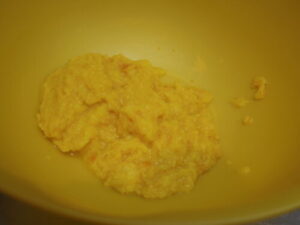 これが丸ごと煮た後にブレンダーにかけたオレンジペースト。こんなにたくさん入れて大丈夫かな、焼く前のケーキ生地も何かめっちゃ緩いんですけどーっと、不安になりながらオーブンに入れました。