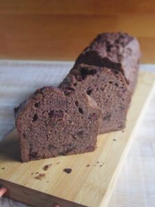 写真はチョコレートフルーツケーキ。自家製オレンジピールとラム酒に漬けこんだドライクランベリーとレーズンを使っています。ケーキ生地には溶かしたクーベルチュールチョコレートとココアを混ぜ込んでます。